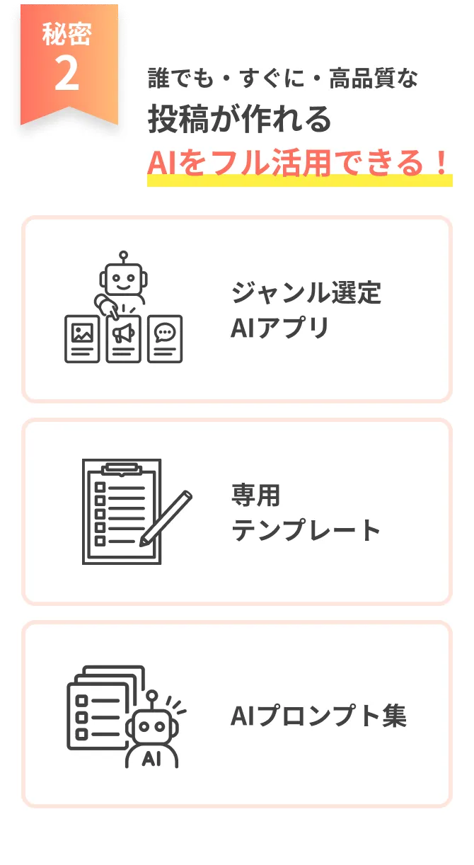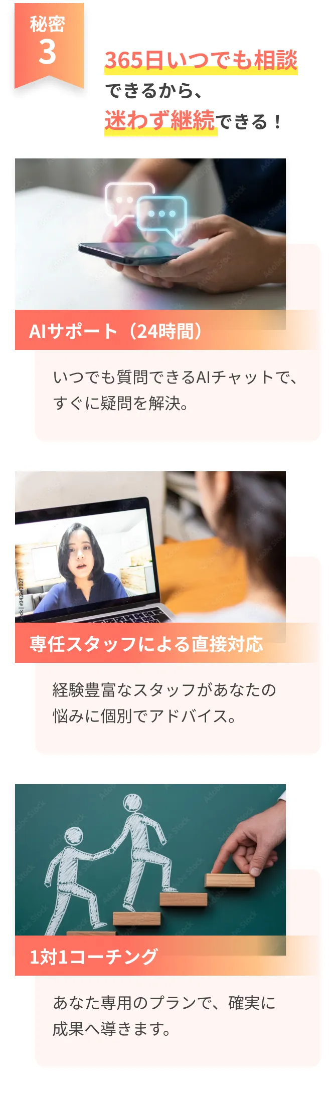 AI24時間サポート・専任スタッフの直接対応・1対1コーチングの3つのサポートが揃っています。